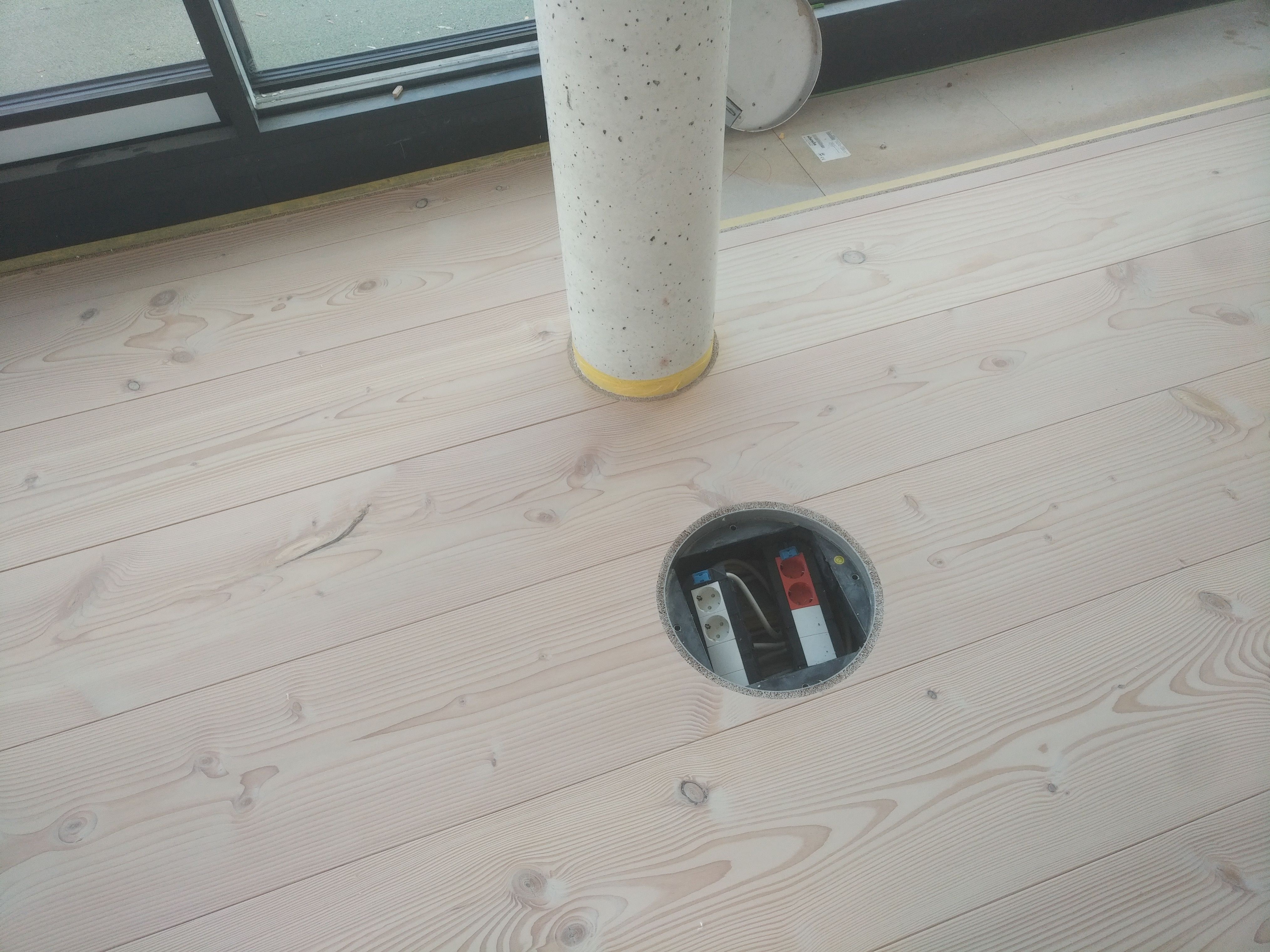 Die baulichen Gegebenheiten wie Bodensteckdosen, Lüftungsauslässe, Säulen und Konvektoren wurden passgenau in die Dielen vor Ort eingearbeitet, ohne diese zu durchtrennen.