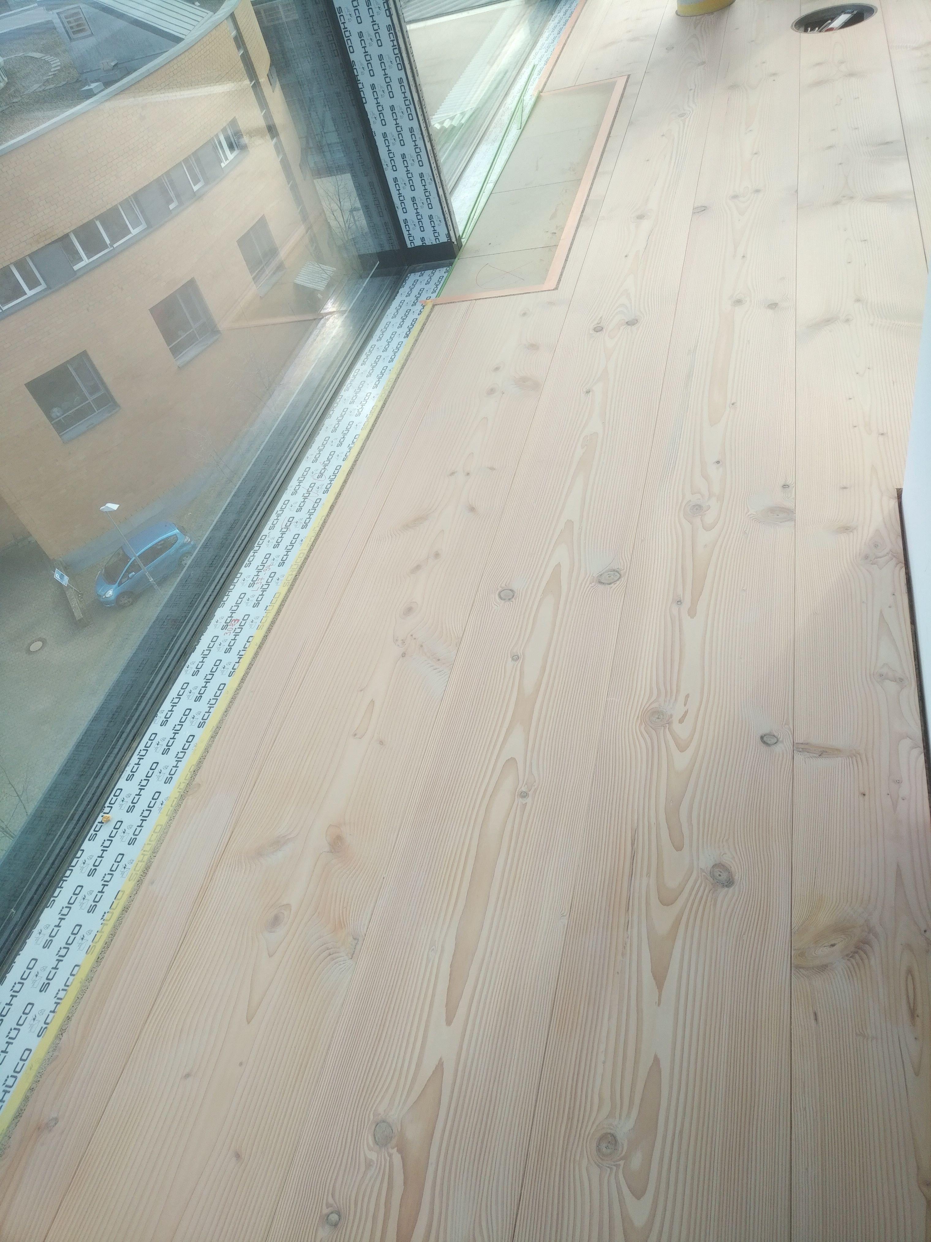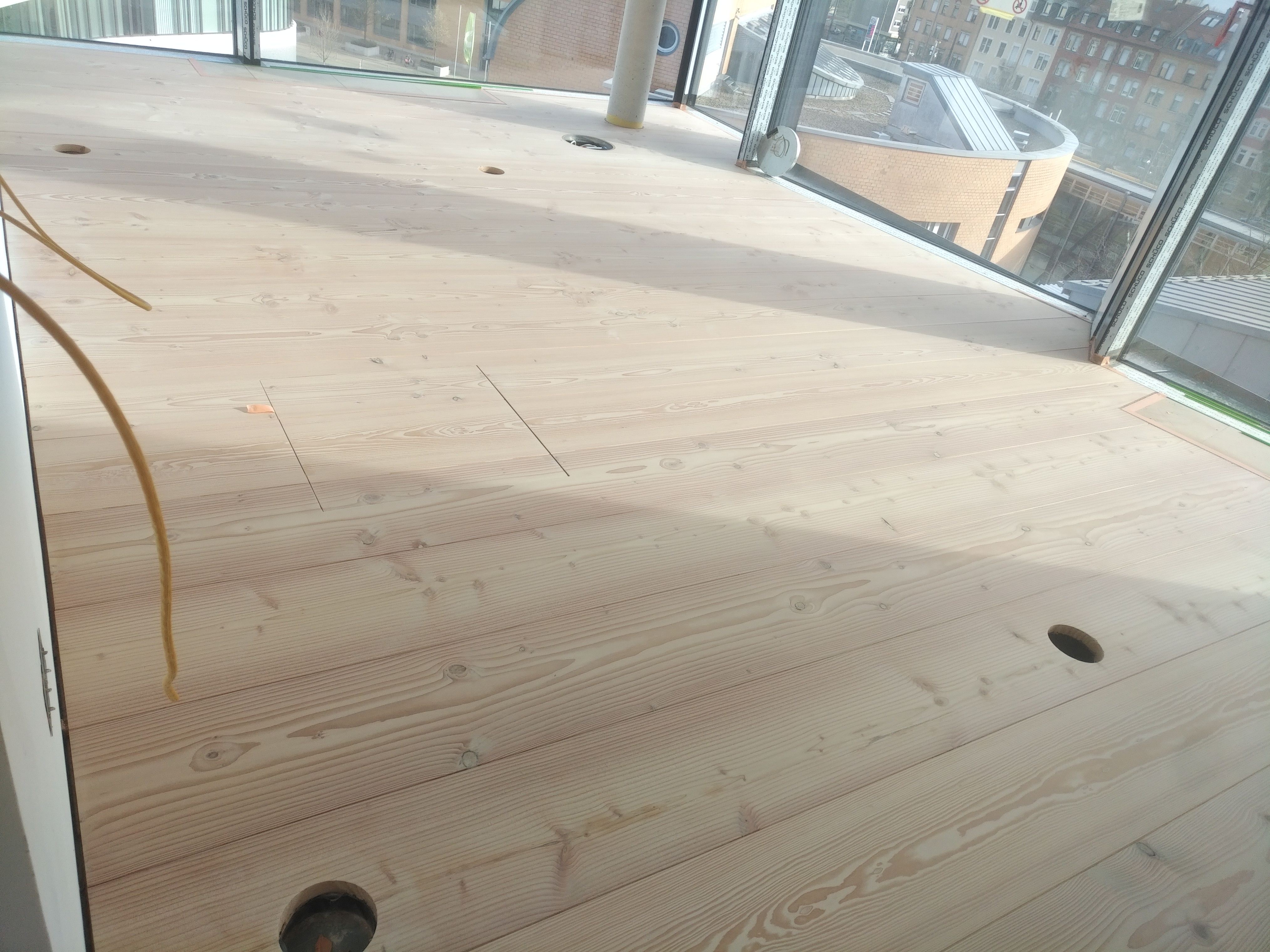 Es wurden alte Douglasien-Bäume gekauft. Aus diesen wurden dann raumlange Dielen bis zu 10,40 Meter Länge von einer deutschen Manufaktur für diesen Projekt maßgefertigt und getrocknet.