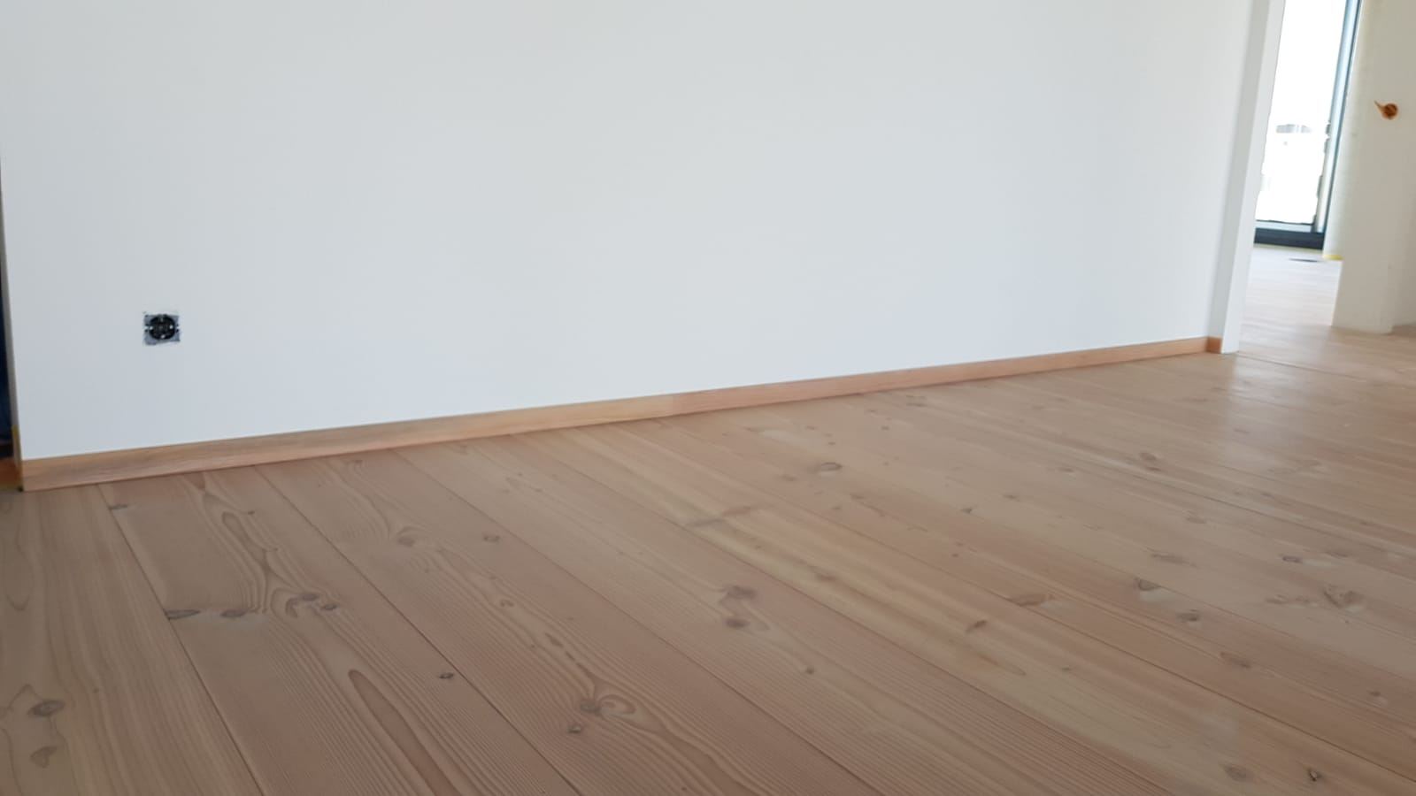 Die Herstellung der Sockelleisten erfolgte ebenfalls in der Manufaktur aus Douglasien Stämmen. In unserer Werkstatt wurden diese nach Anlieferung gelaugt und weiß geölt um eine identische Optik zu den verlegten und endbehandelten Dielen zu erzielen.